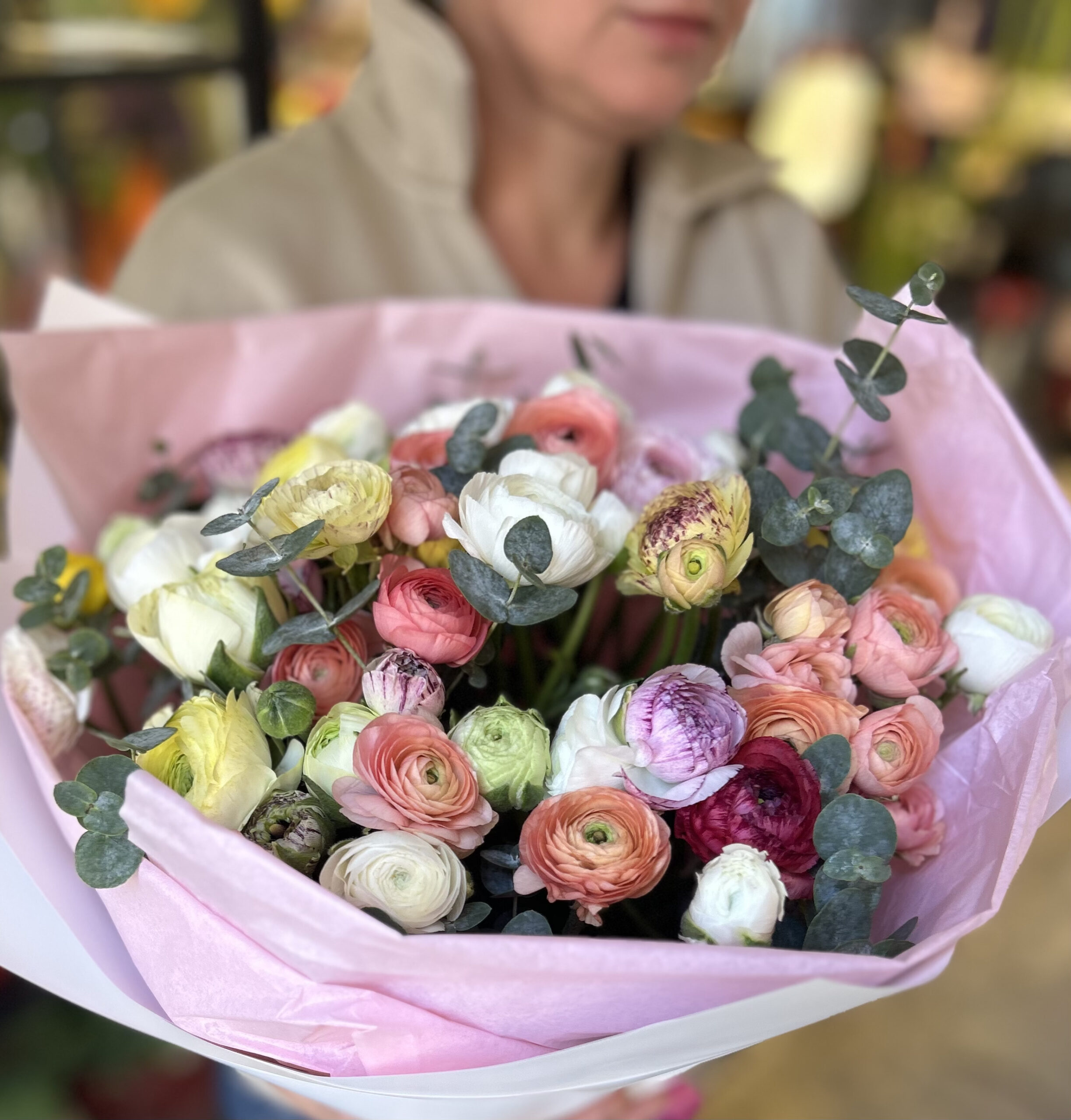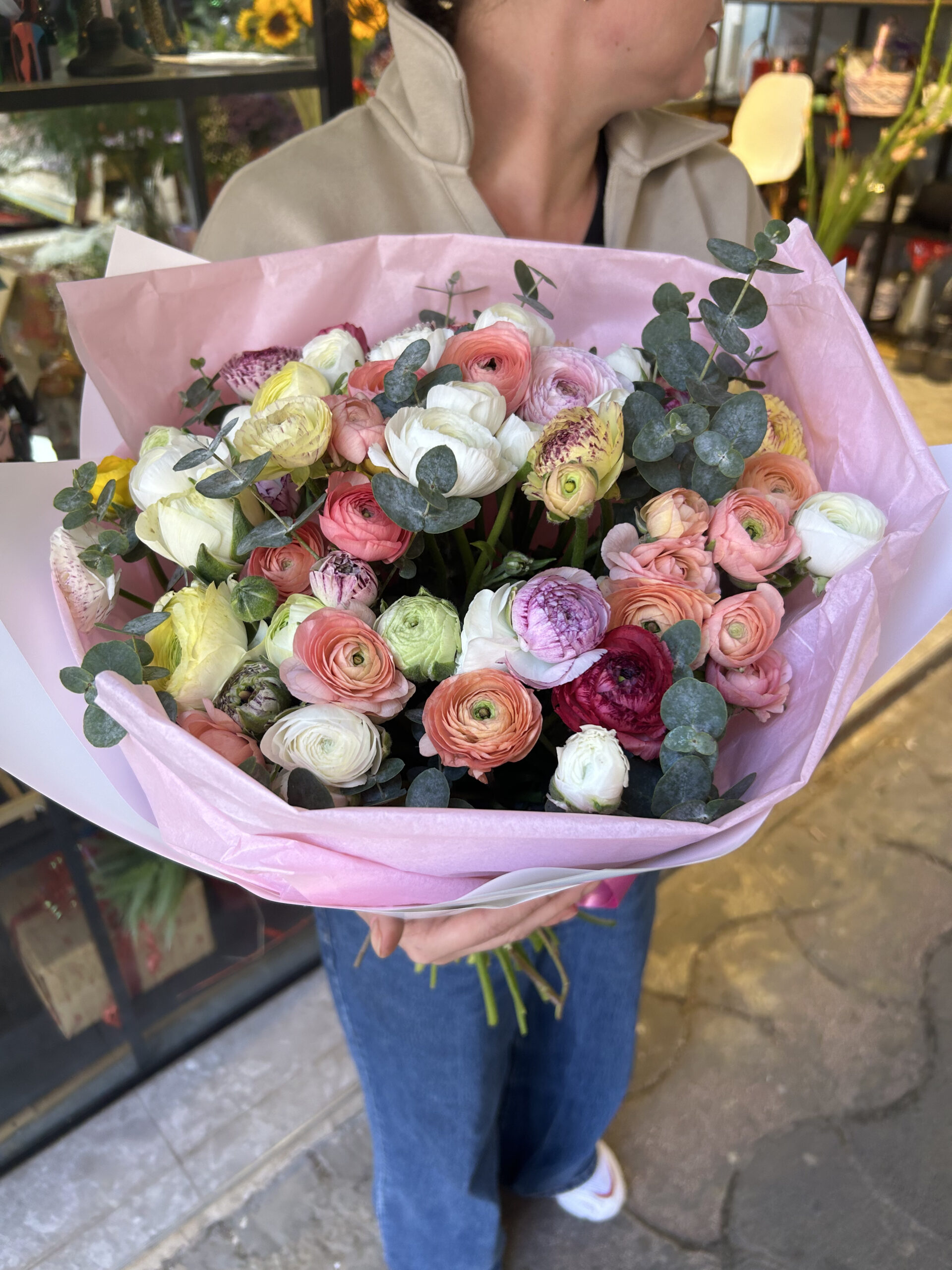 bouquet of mixed ranunculus is the epitome of refined elegance and charm. This arrangement combines vibrant and pastel shades, creating a harmonious composition that pleases the eye and warms the soul.