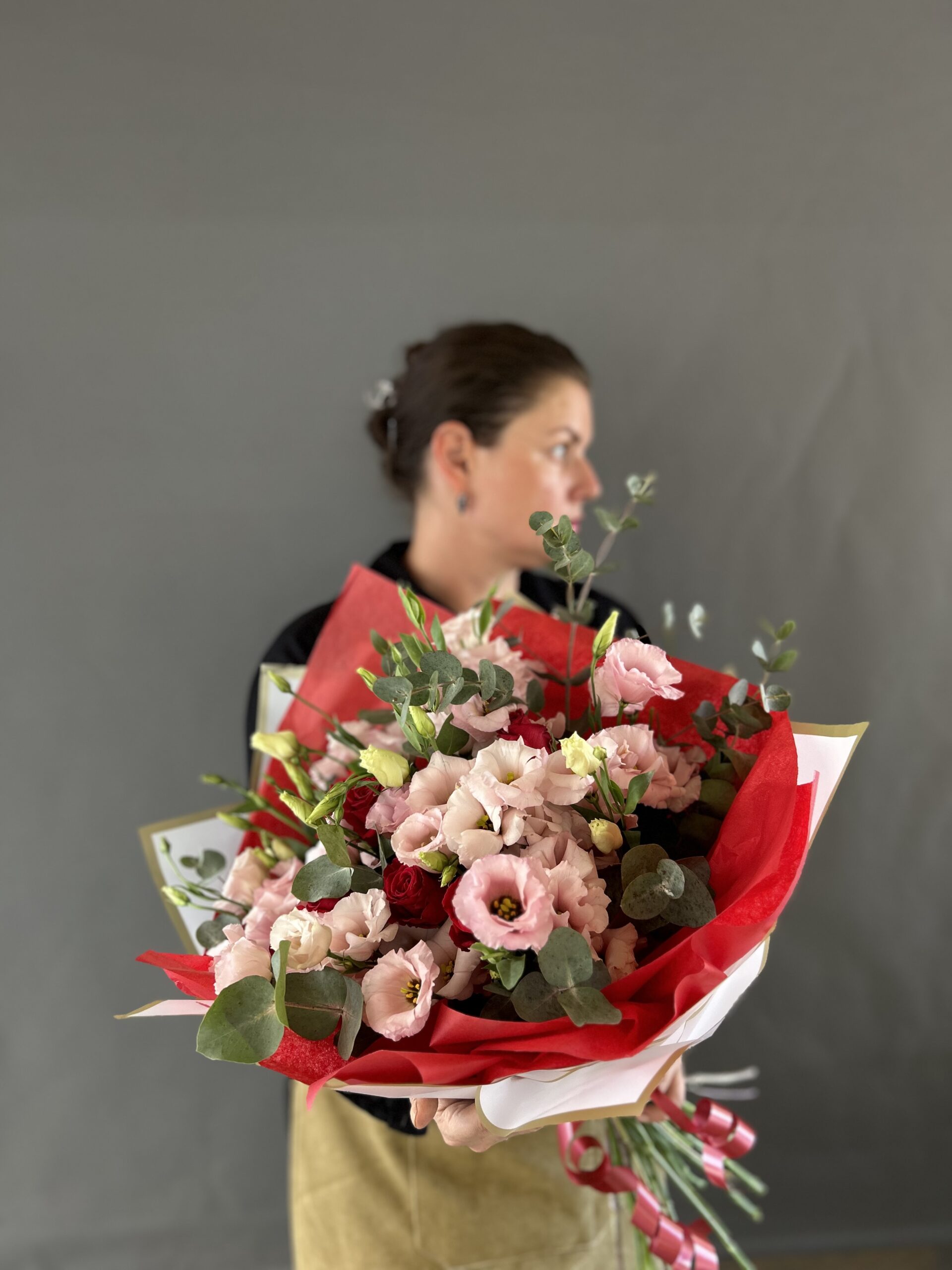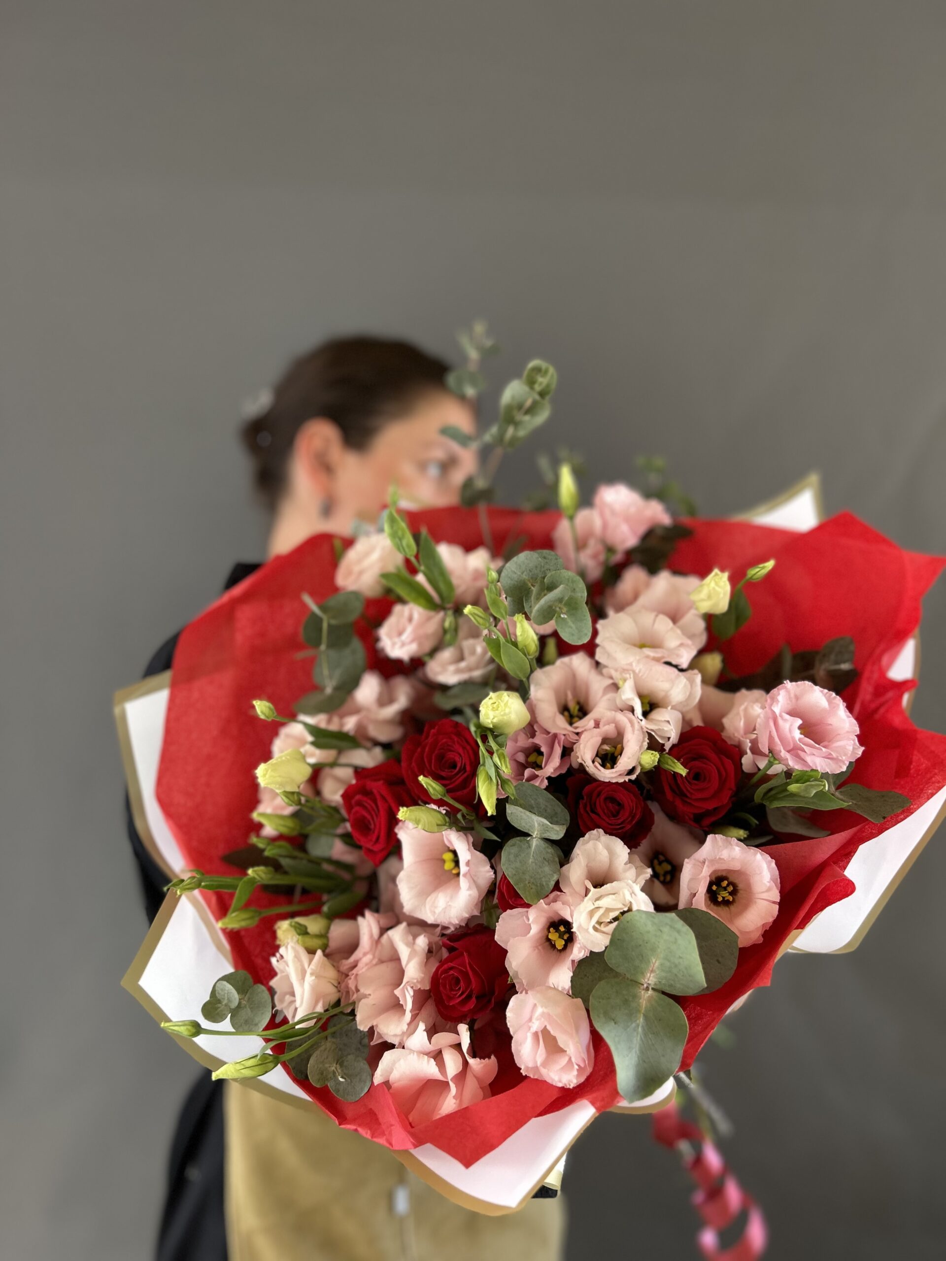 This bouquet radiates the fire of emotions, with vibrant red roses at its center, symbolizing passion and strength. Their rich hue perfectly contrasts with the softness of pink lisianthus, adding tenderness and romance.