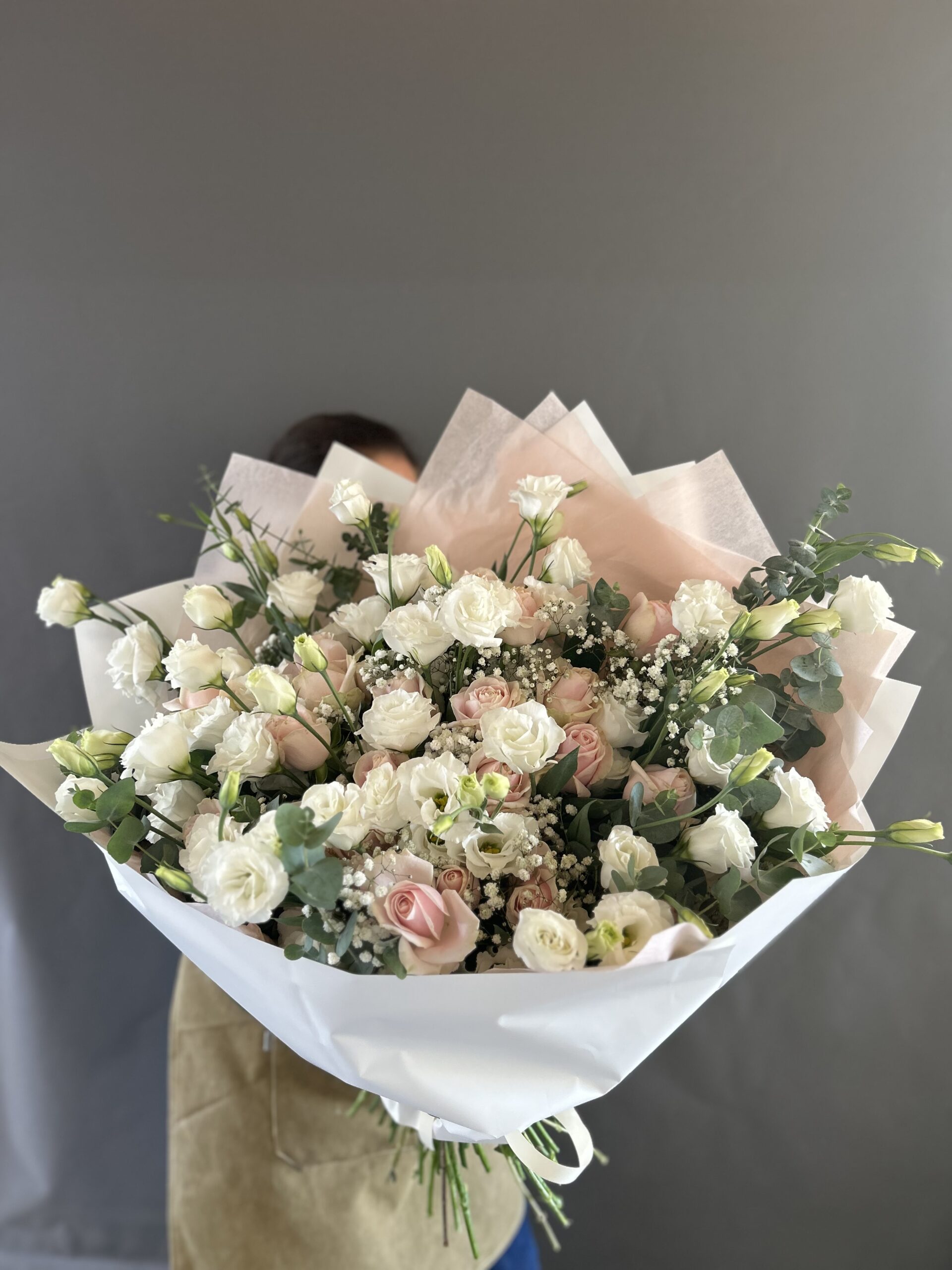 The wrapping, done in pastel pink and white tones, emphasizes the elegance and softness of the arrangement. “Gentle Charm” is perfect for special occasions such as declarations of love, birthdays, or celebrations, conveying the warmest and most heartfelt emotions.