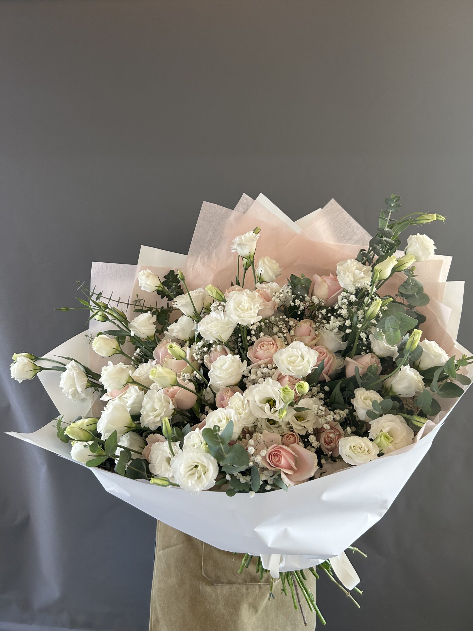 The bouquet is centered around elegant soft pink roses, symbolizing romance and sophistication. They are beautifully complemented by white lisianthus, which adds a touch of lightness and refinement to the composition.