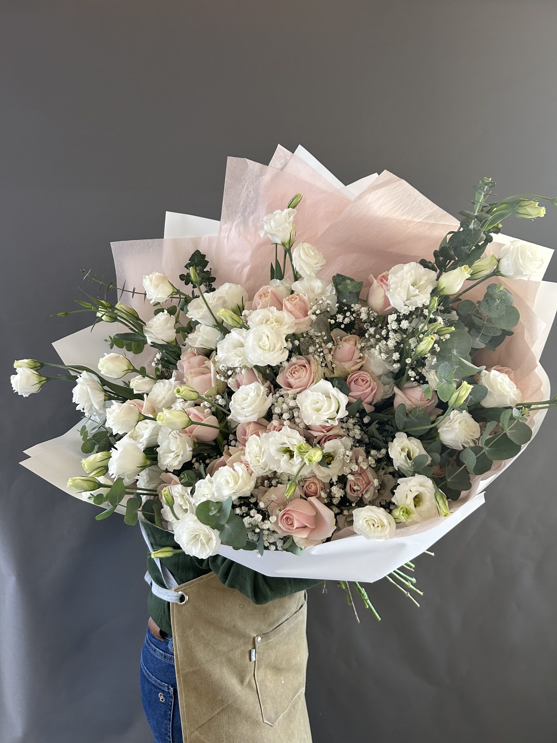 The bouquet’s airy feel is achieved through the use of delicate gypsophila flowers, which act as a soft backdrop, enhancing its volume and tenderness. Eucalyptus leaves add freshness and texture, completing the overall look.