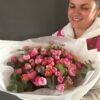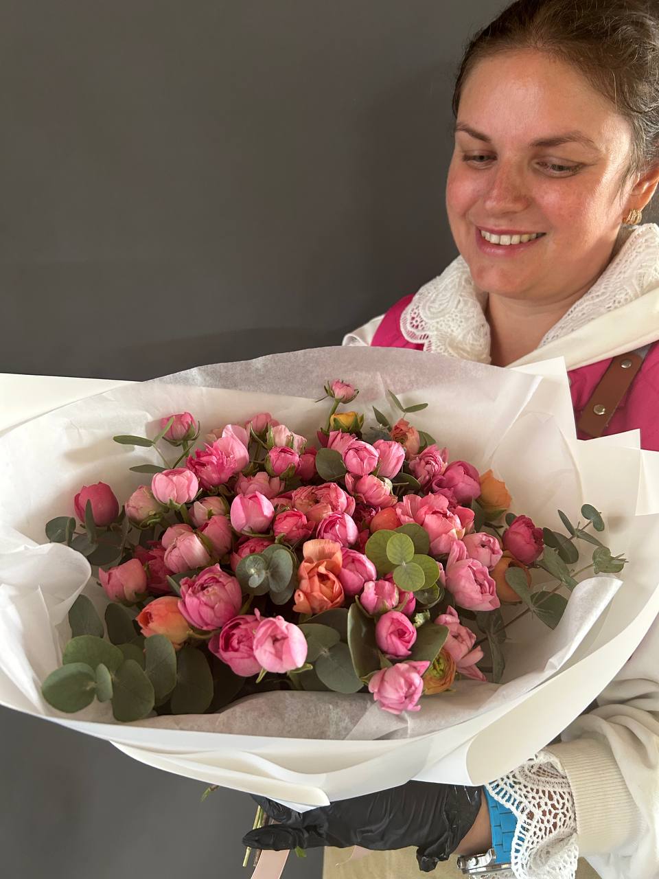 A radiant bouquet that captures the essence of joy and elegance. Delicate pink and coral roses blend with fresh eucalyptus leaves, wrapped in crisp white paper for a refined finish. This floral arrangement brings warmth and charm to any occasion — from heartfelt gifts to stylish decor.