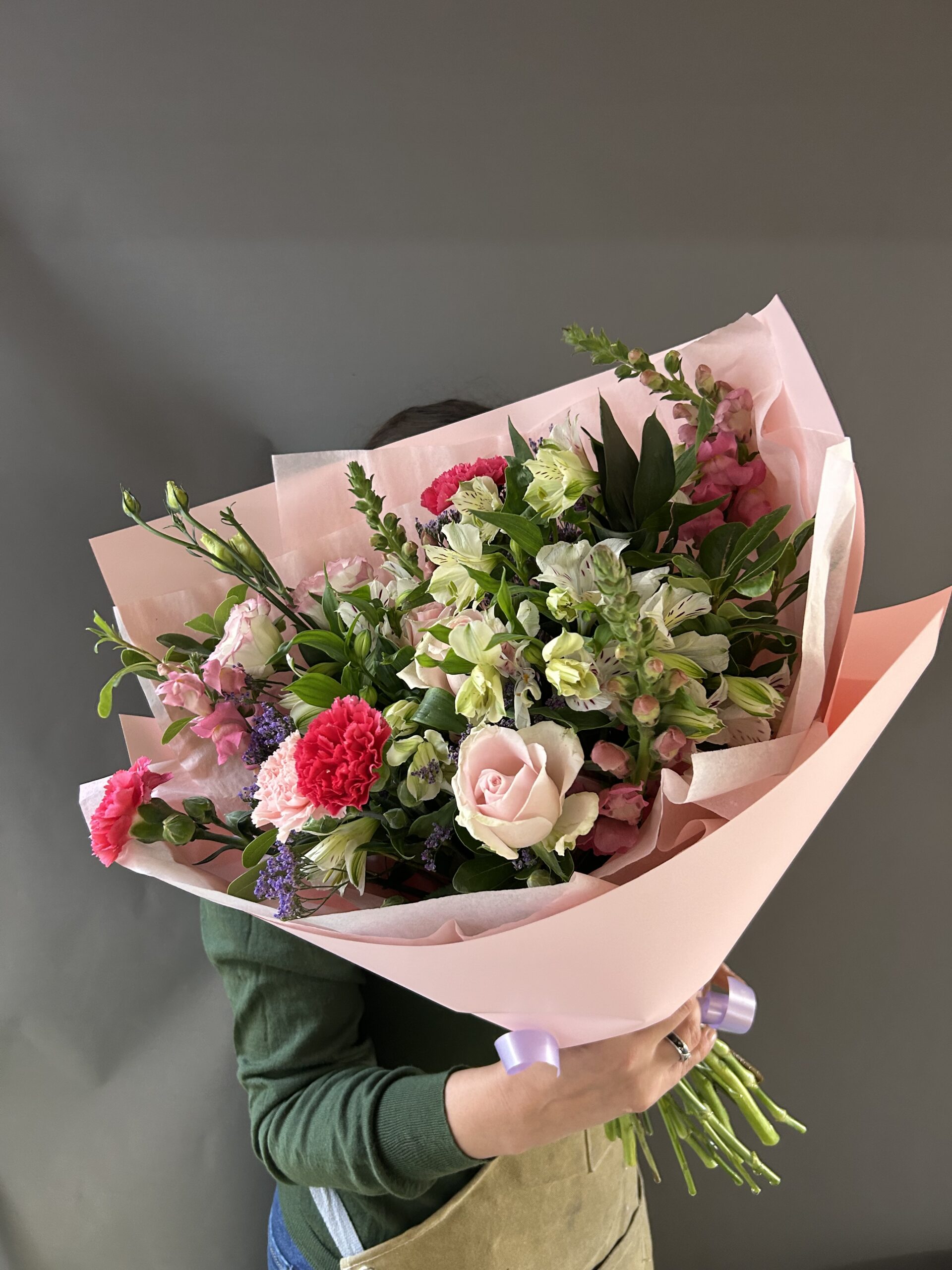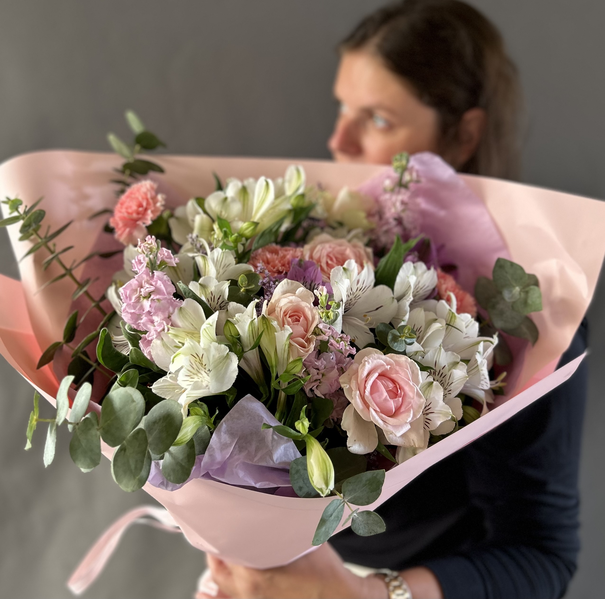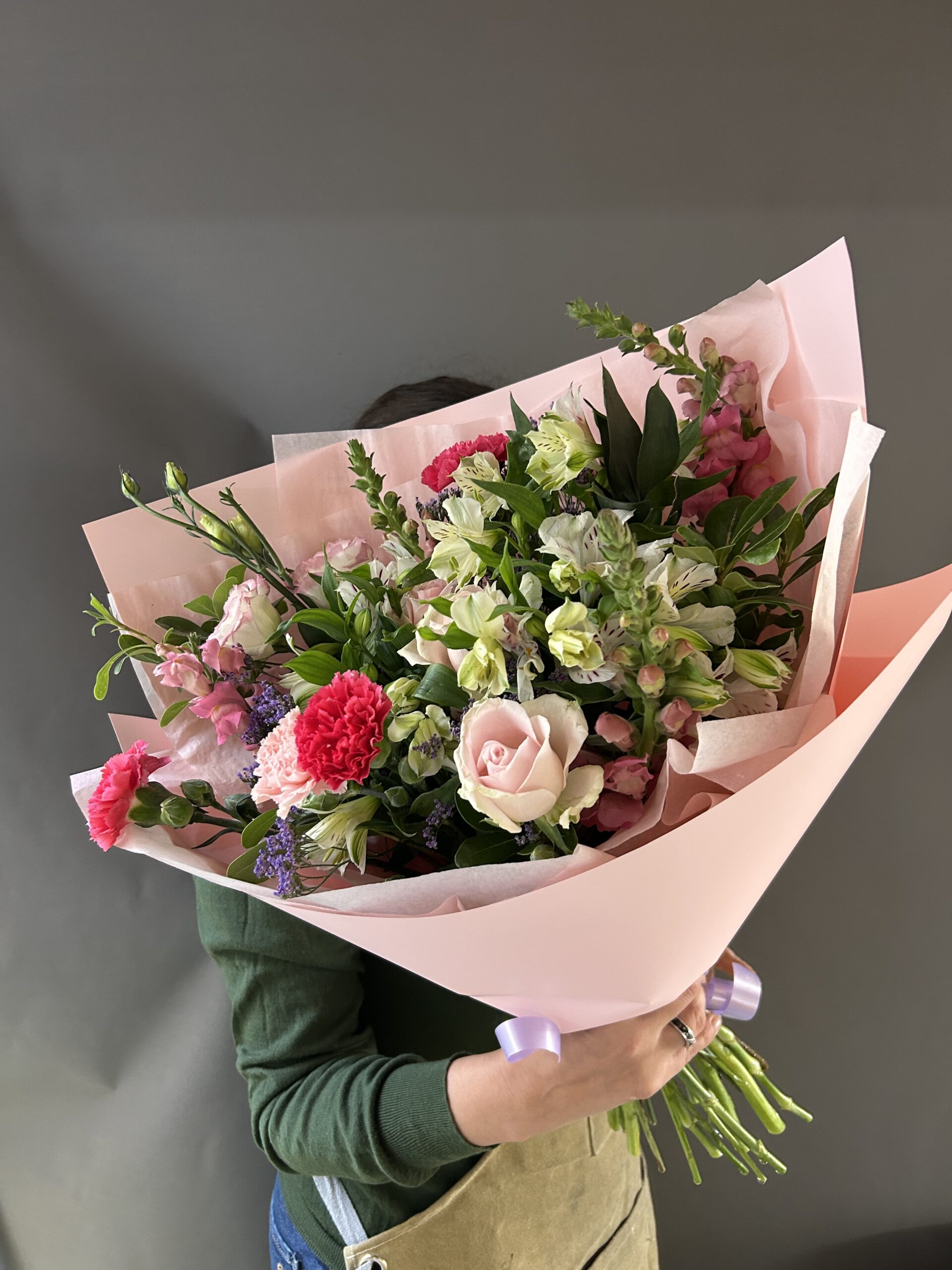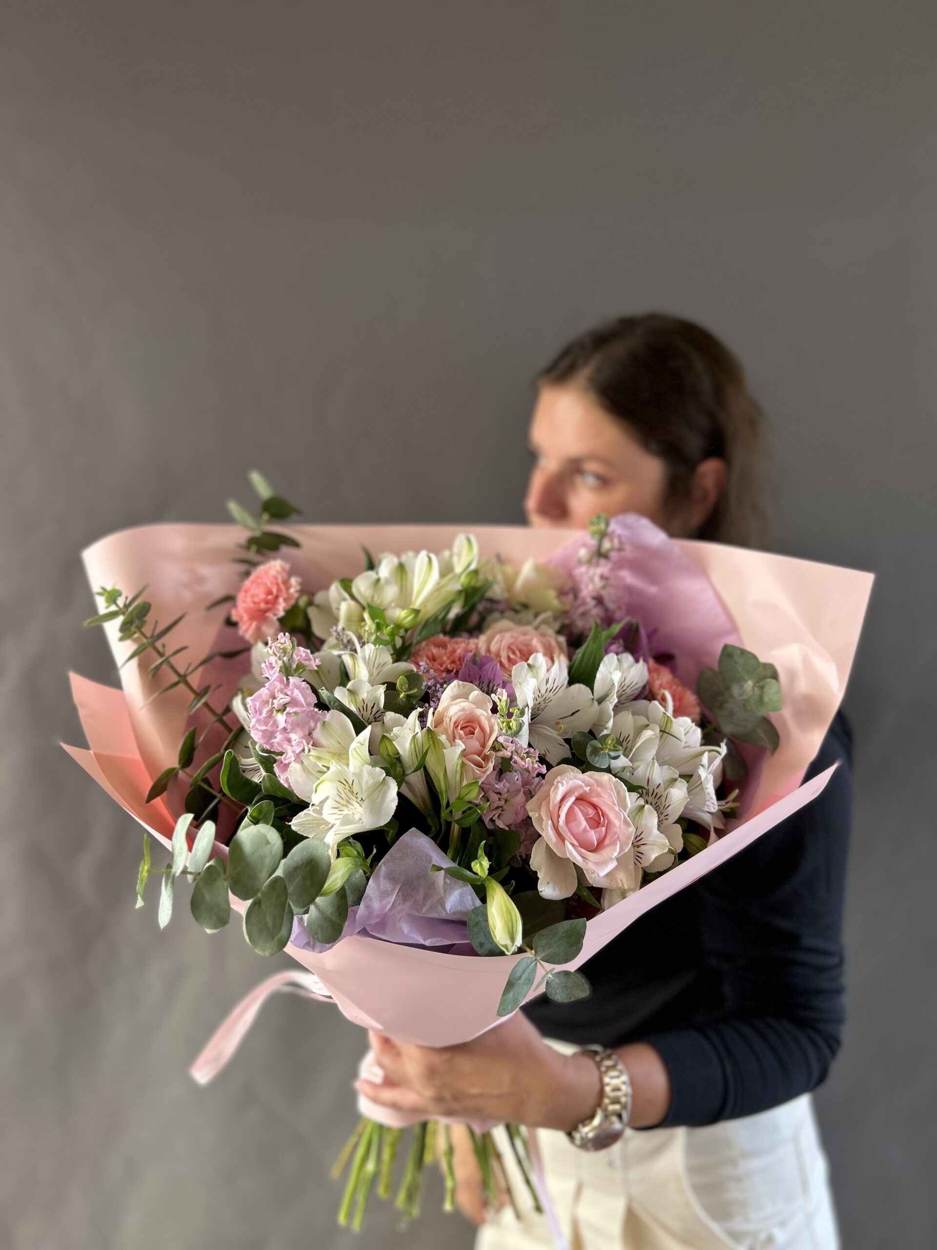 The bouquet is designed in a delicate, romantic palette, with pastel pink roses as the main highlights, symbolizing sophistication and love. Pure white alstroemerias add lightness and elegance to the composition, creating a contrast with the richer tones. Carnations provide volume and texture, emphasizing the refinement of every detail.