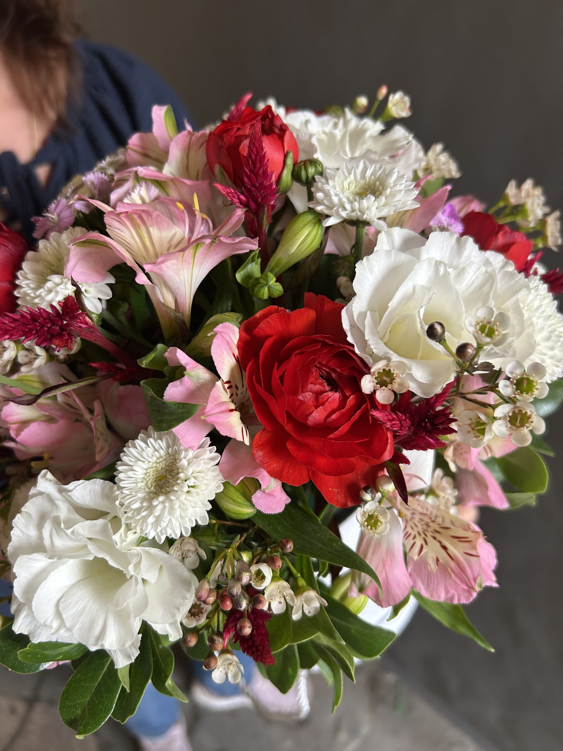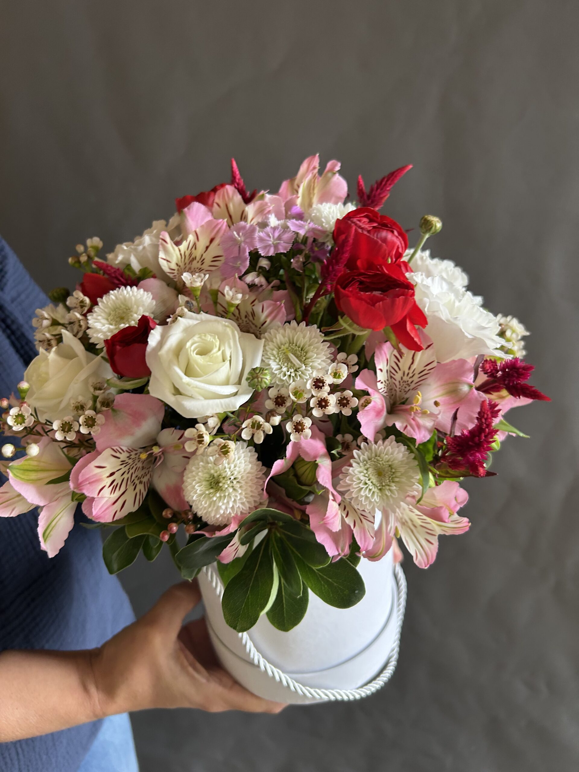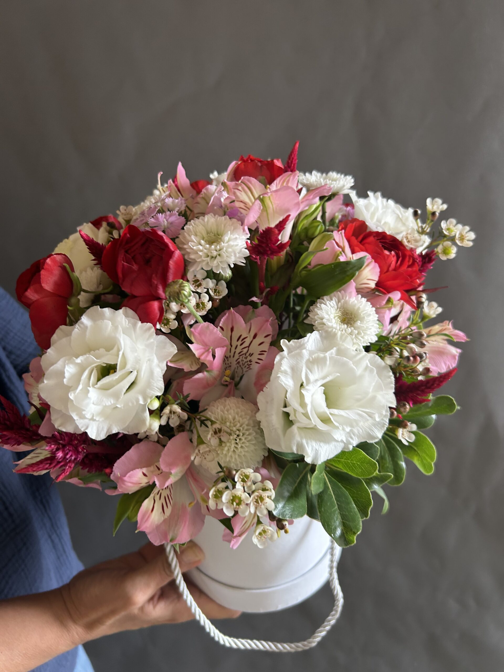 The central focus of the bouquet is vibrant ranunculus, symbolizing passion and energy. Delicate white lisianthus adds lightness and freshness, creating the perfect contrast to the deep red hues. Soft pink alstroemerias bring harmony and seamlessly tie the elements of the arrangement together.