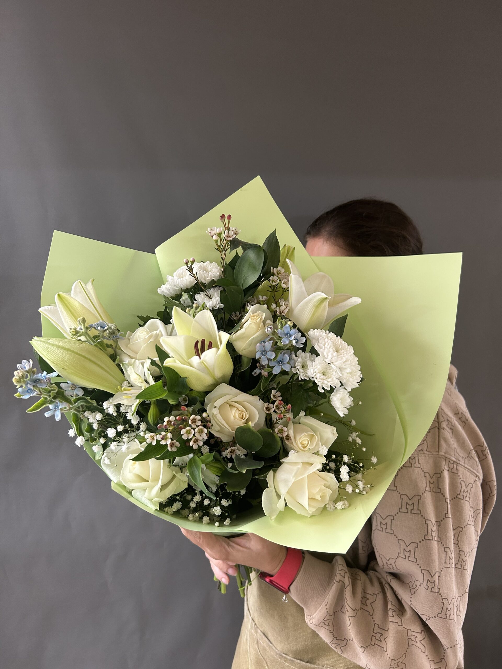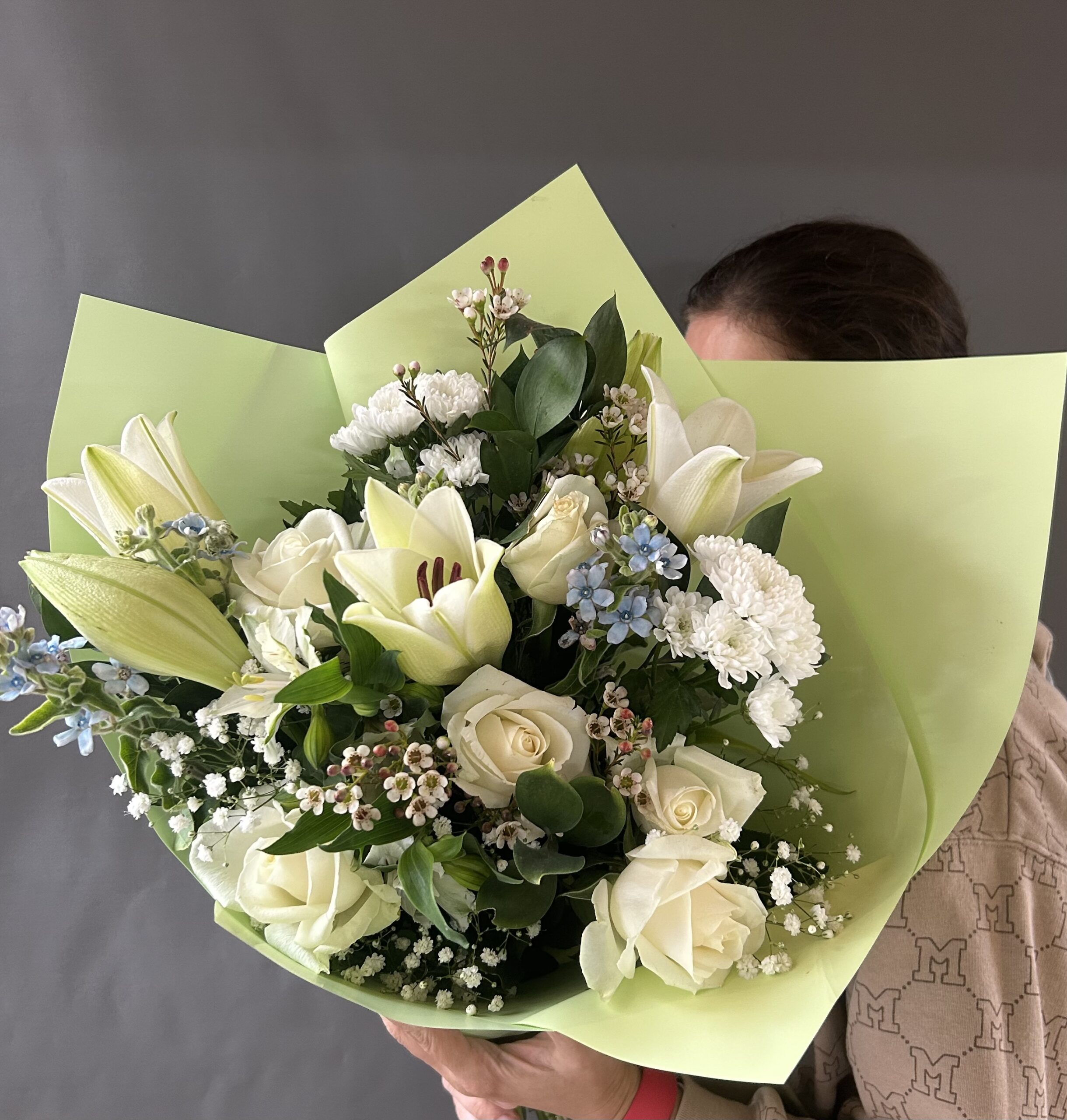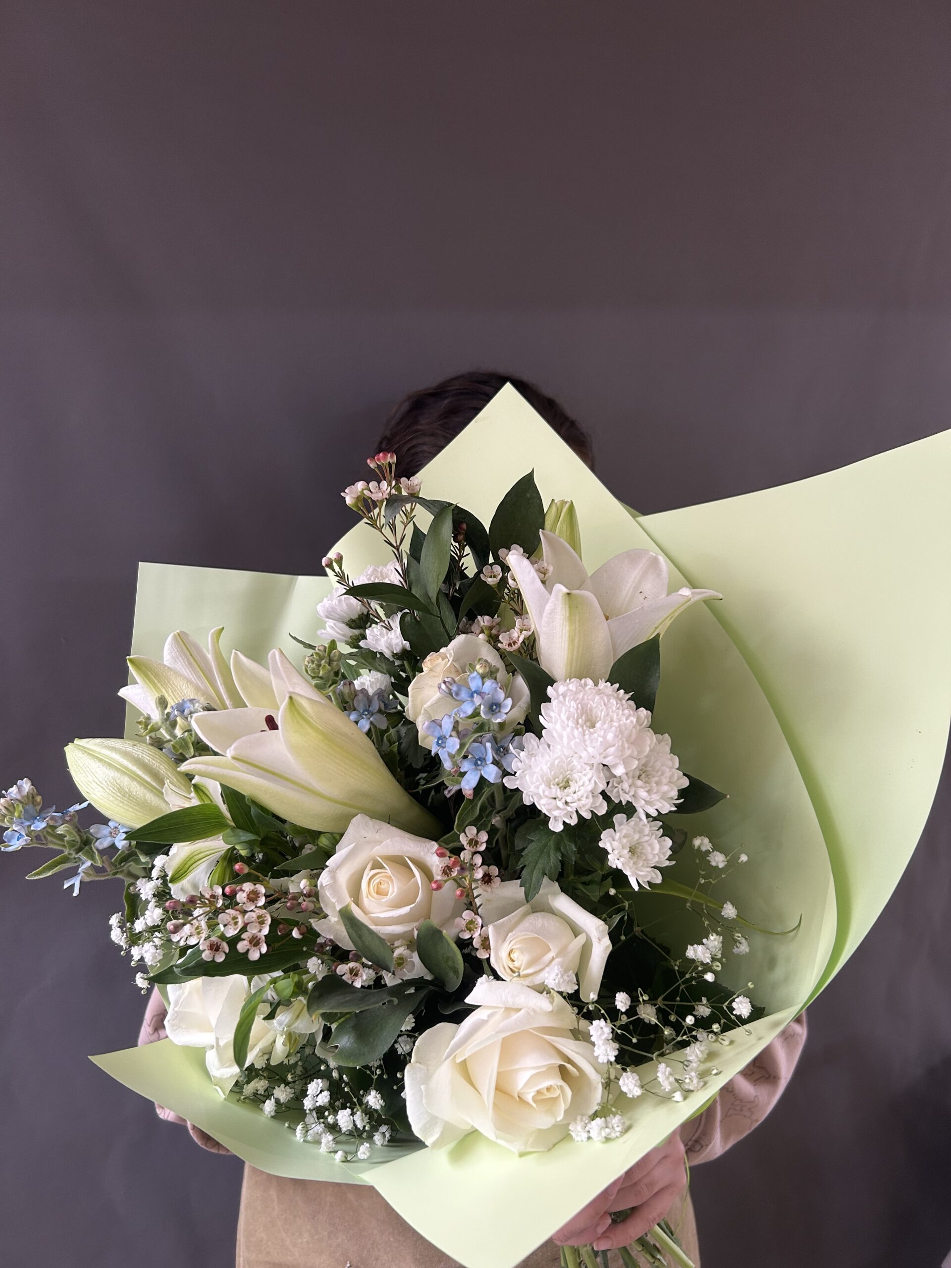 The composition is crafted in a light, cool-toned palette. The bouquet is centered around white roses, symbolizing purity and elegance. White lilies, with their expressive blooms, add volume and serve as the focal point of the arrangement. Delicate blue tweedia flowers create a refined accent, adding sophistication and lightness.