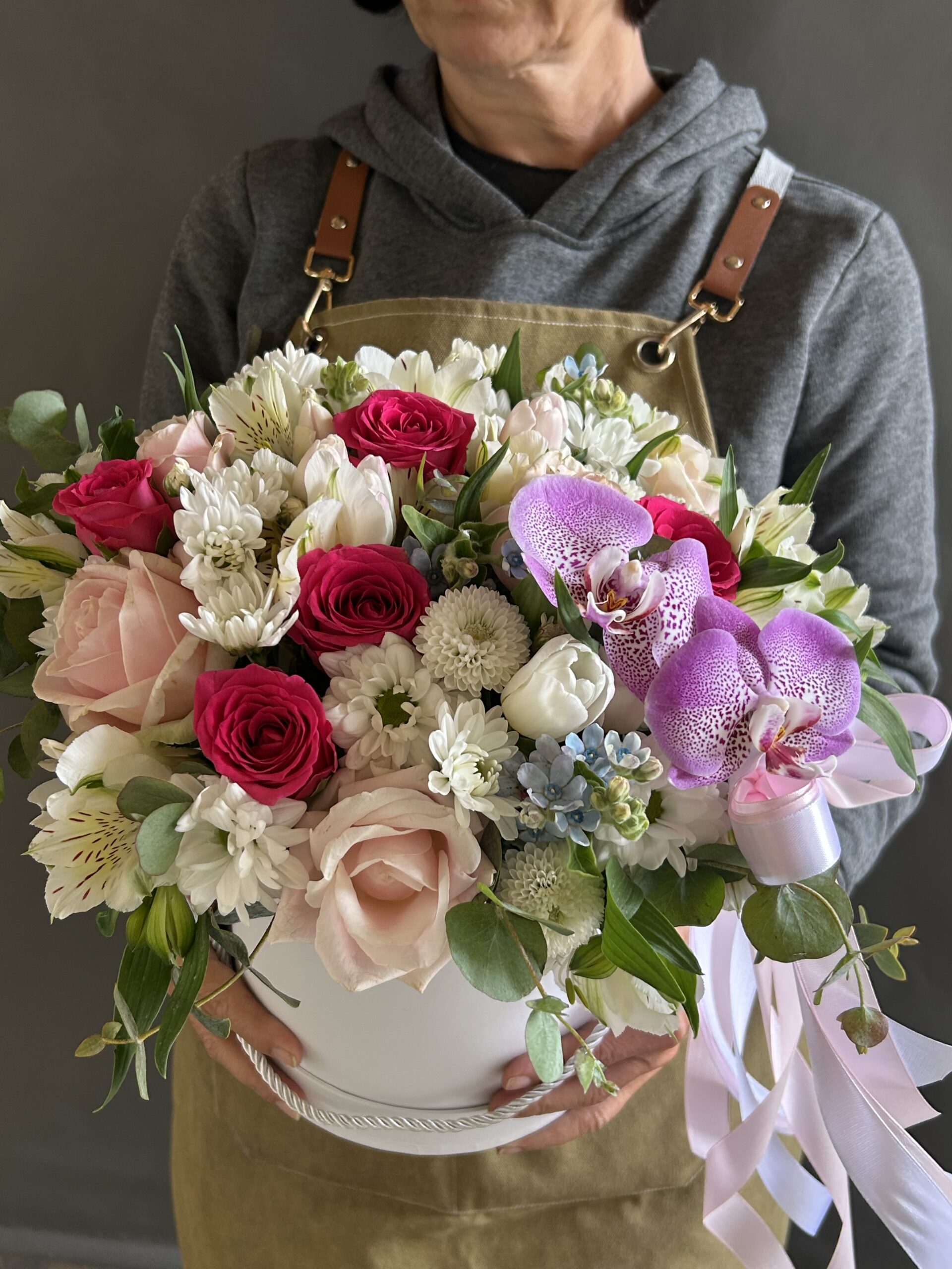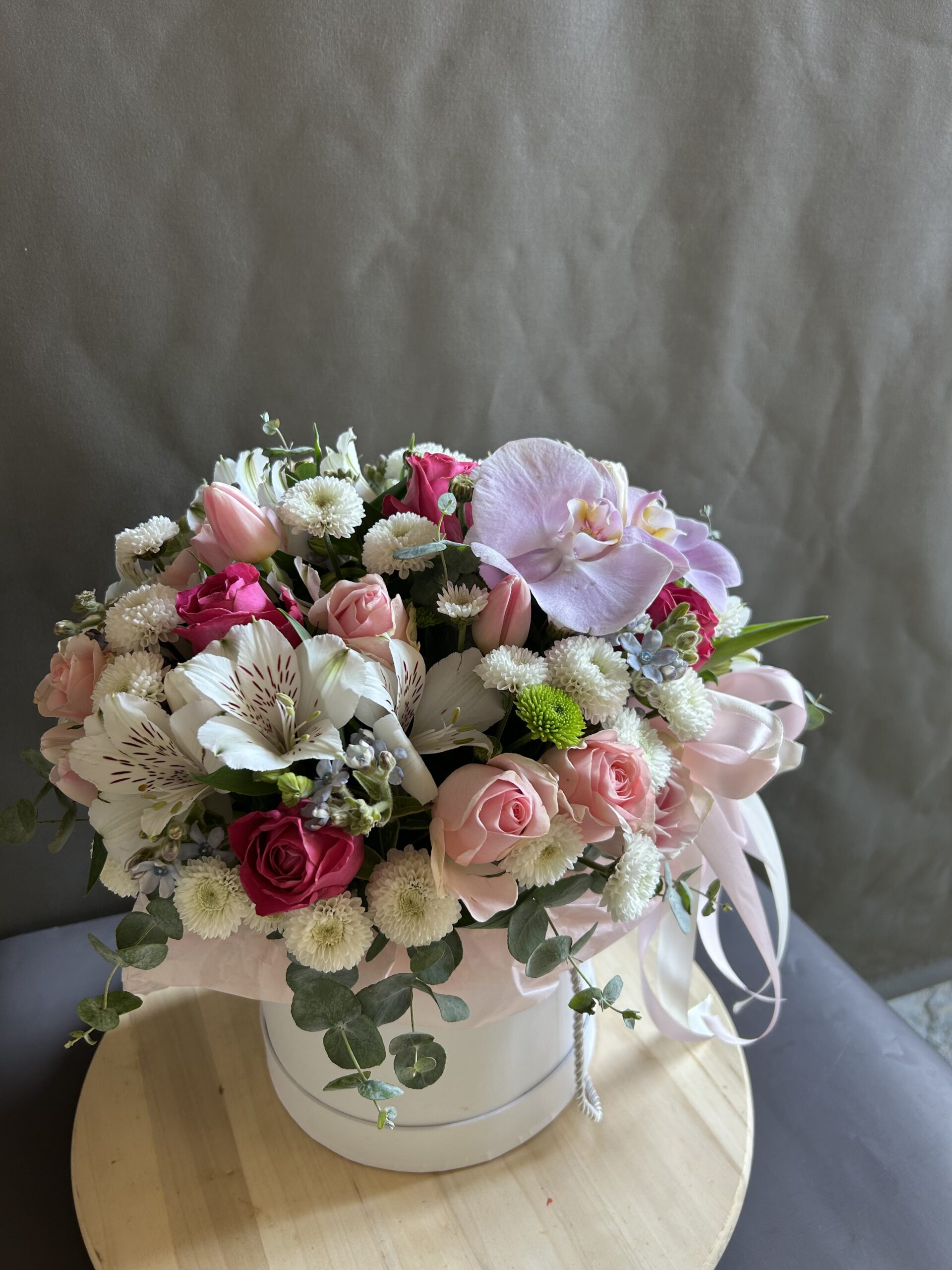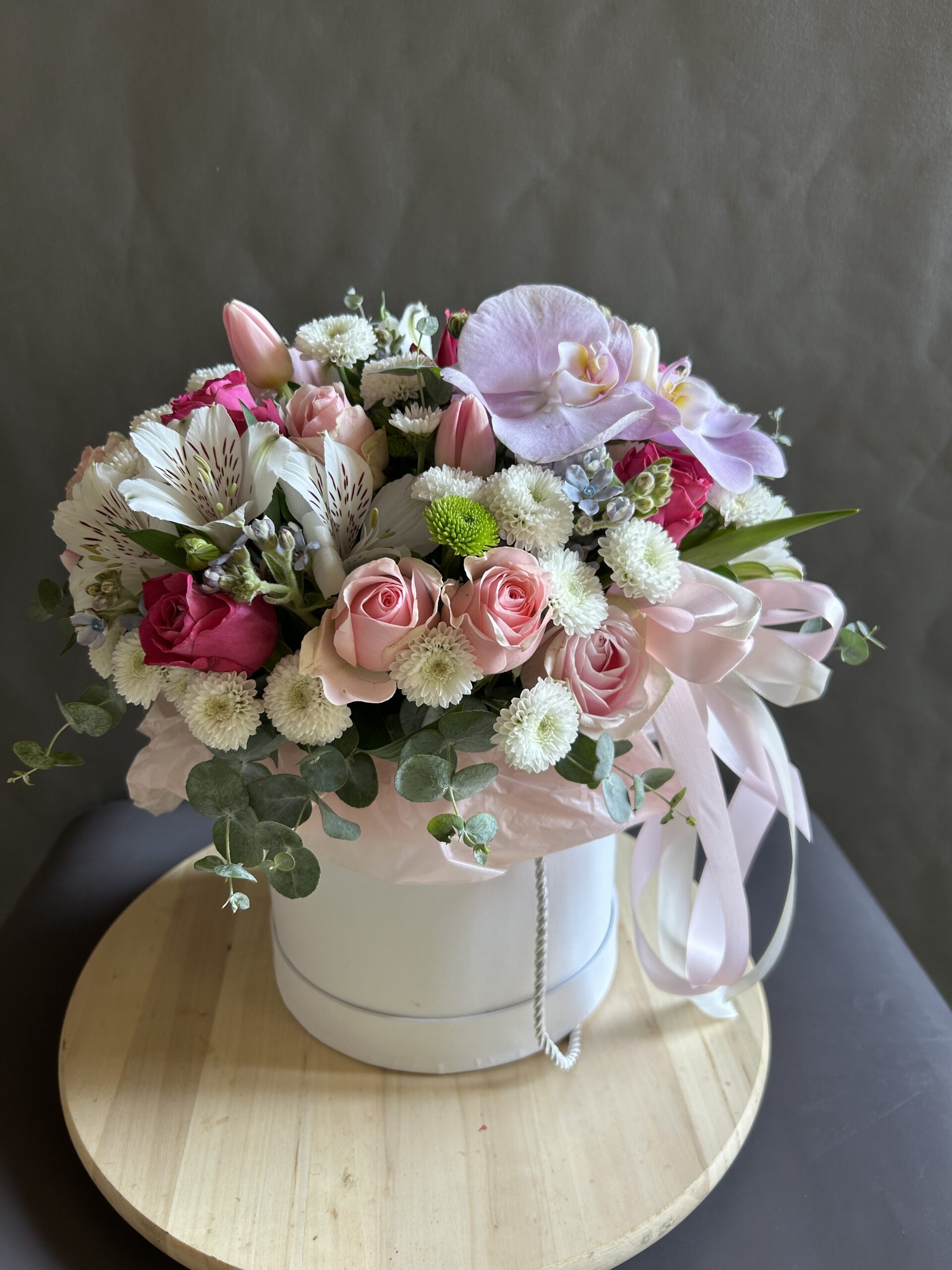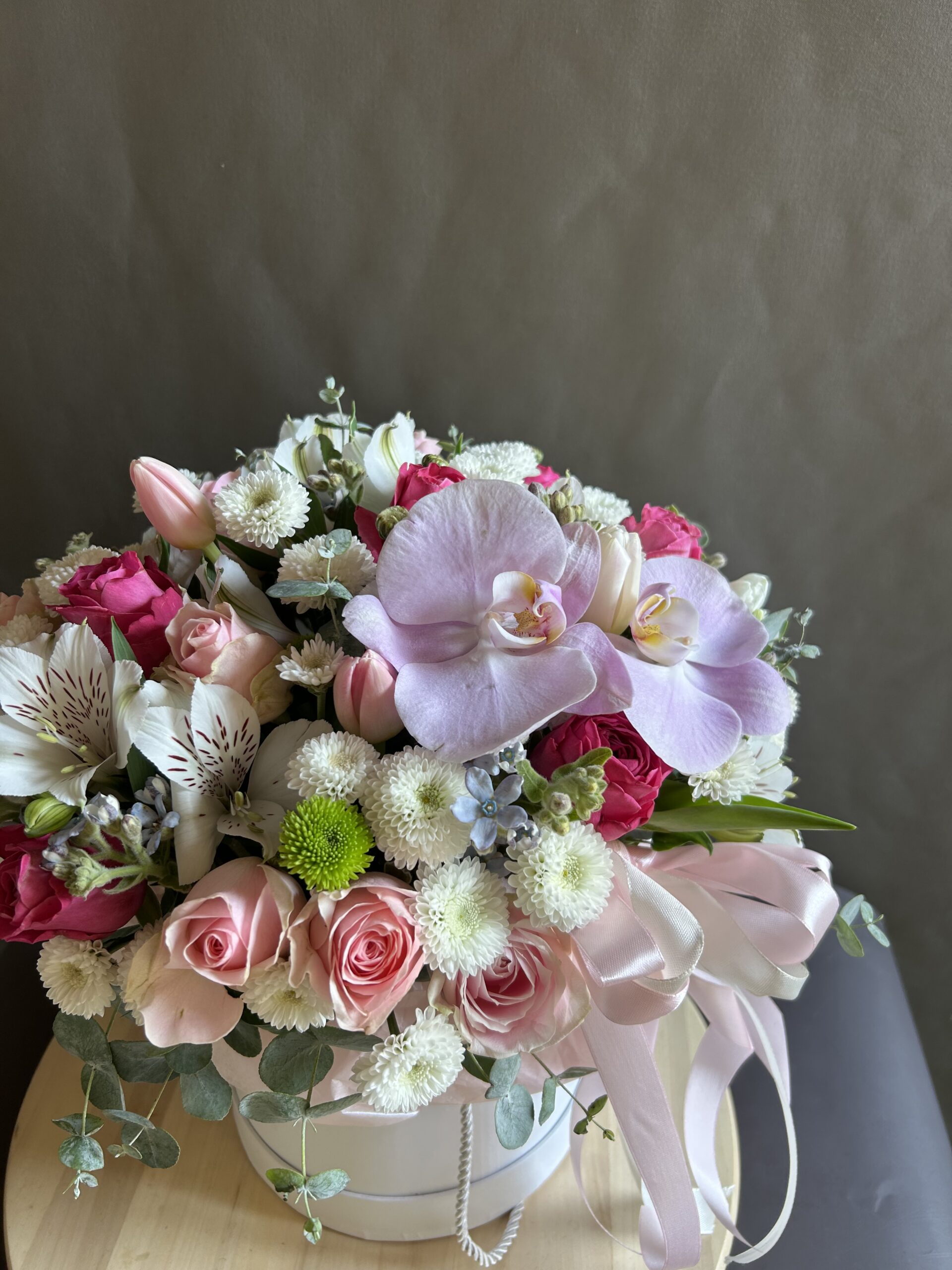 This arrangement is a harmonious combination of pink and cream roses, vibrant fuchsia spray roses, orchids, chrysanthemums, and alstroemerias, complemented by greenery. It is presented in an elegant white box and adorned with ribbons. A perfect choice for a sophisticated gift that conveys tenderness, style, and a festive mood.
