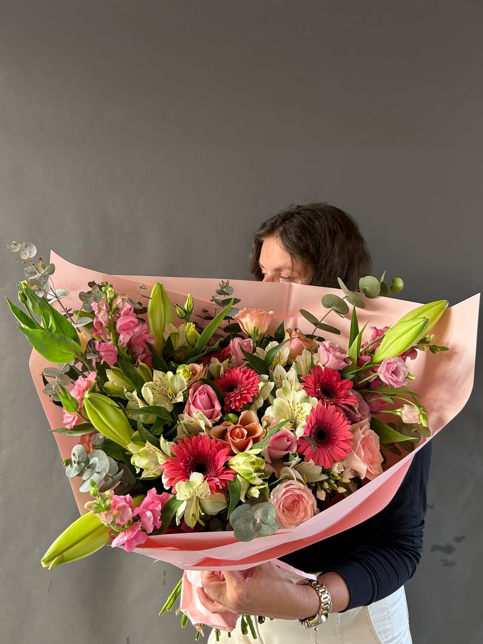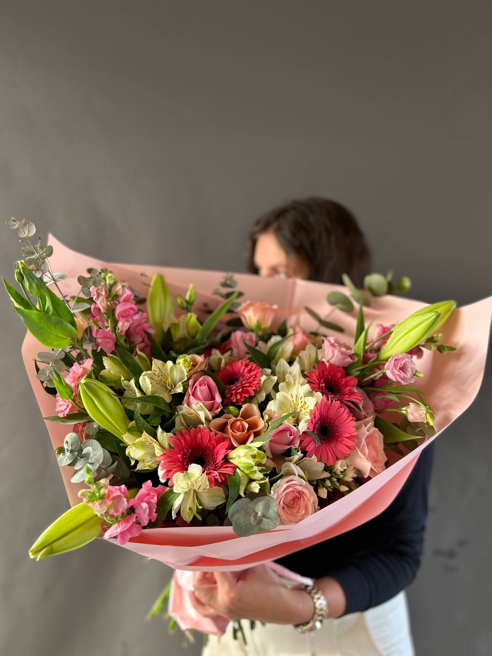 A bright and multifaceted bouquet filled with life and emotion. This elegant arrangement of gerberas, roses, alstroemeria, lily buds, and eucalyptus is wrapped in soft pink paper. It feels as if it was created to express joy, gratitude, or a romantic mood.