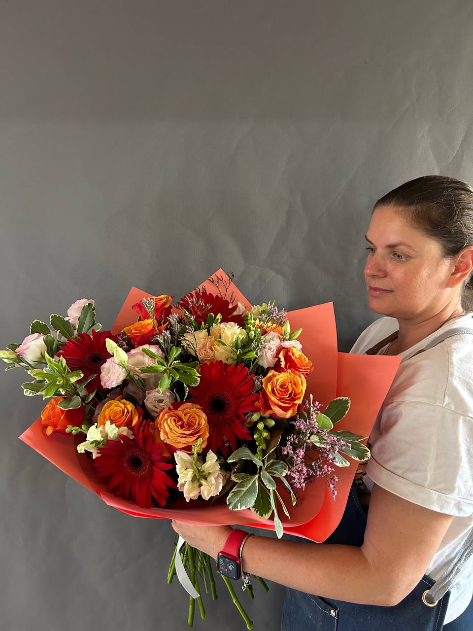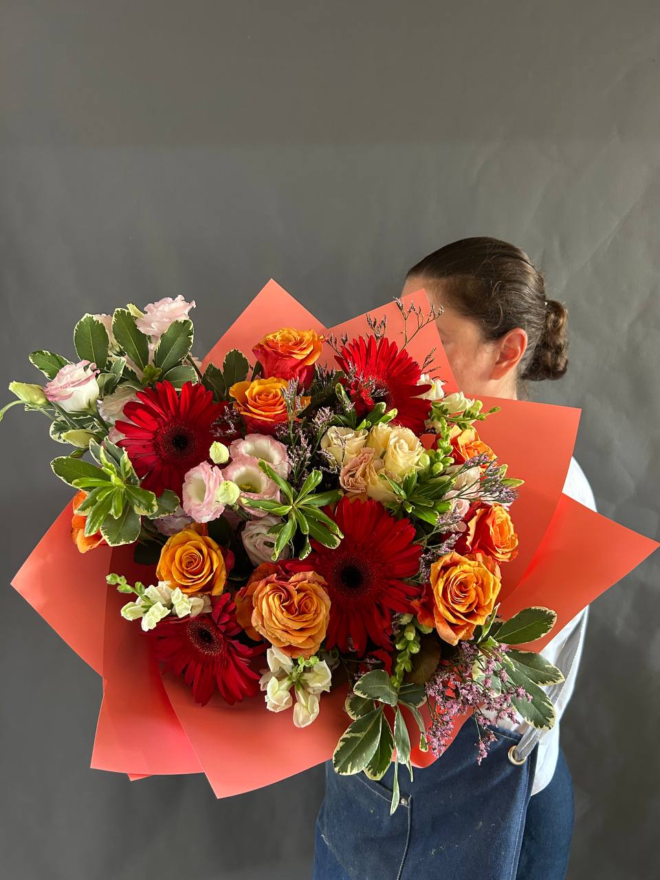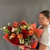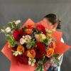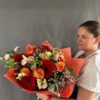 Un bouquet éclatant et plein d’énergie, conçu pour transmettre chaleur et bonne humeur. Composé de gerberas, roses, lisianthus et feuillage décoratif dans une palette inspirée du coucher de soleil — rouges profonds, oranges lumineux et roses tendres. L’emballage orange vif accentue la vivacité de la composition. Idéal pour une célébration, un remerciement ou pour illuminer la journée de quelqu’un avec des couleurs et des émotions.