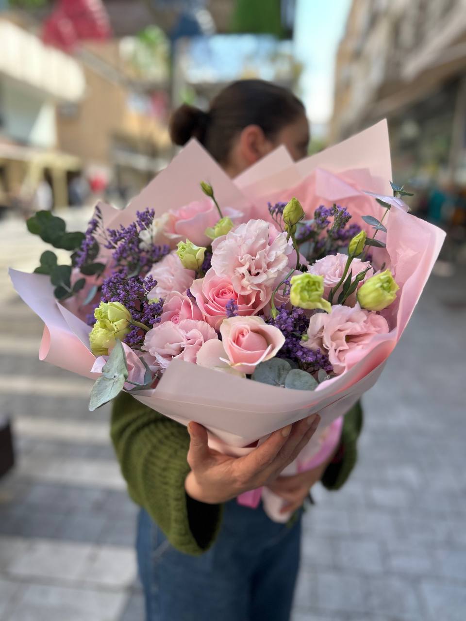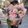Une composition fraîche et élégante où l’énergie urbaine rencontre la douceur naturelle. Roses roses, œillets, boutons verts, statice violette et eucalyptus sont réunis dans un bouquet vivant et moderne, enveloppé de papier rose pâle. Il évoque un accent floral dans le rythme de la ville.
