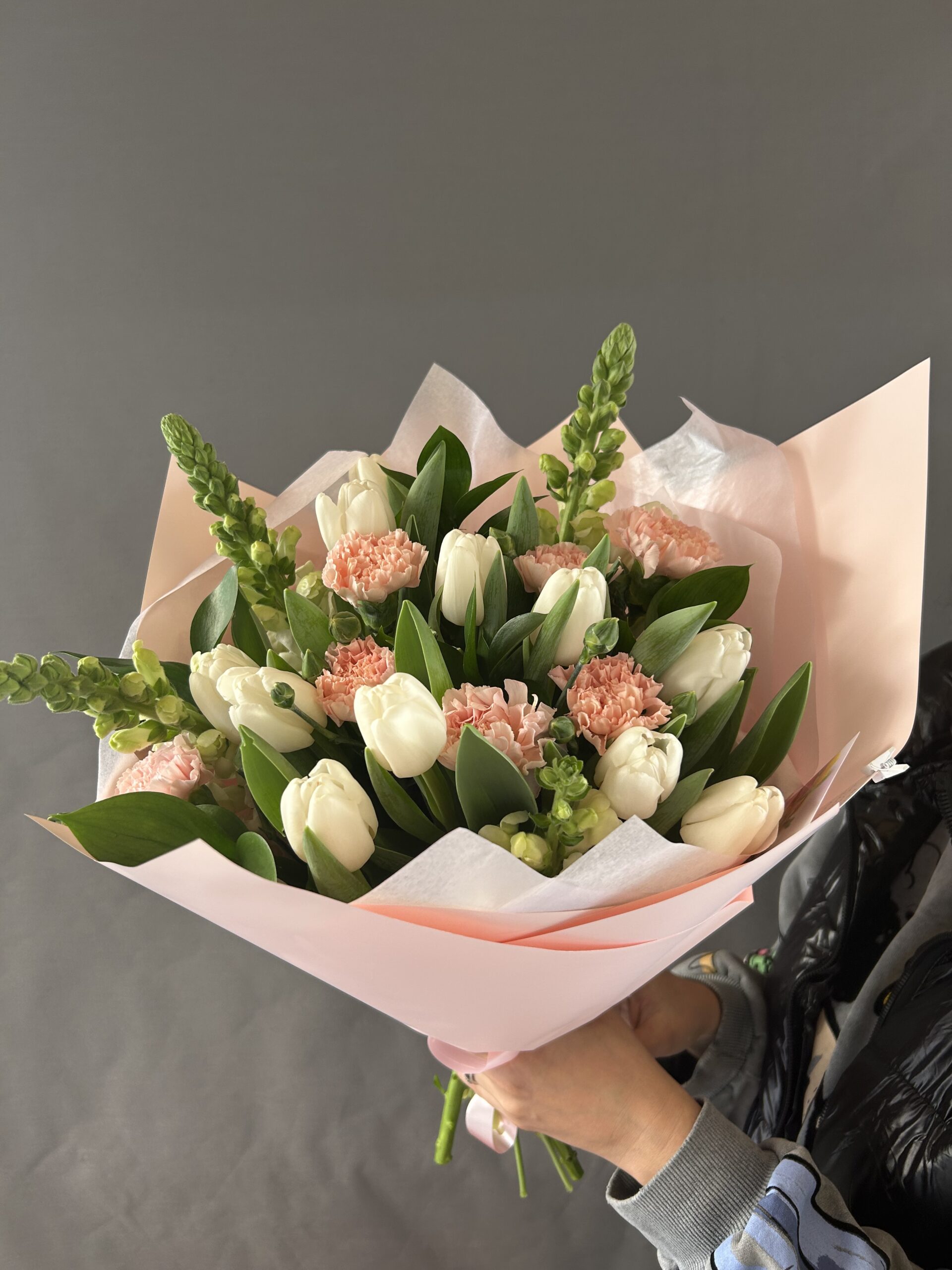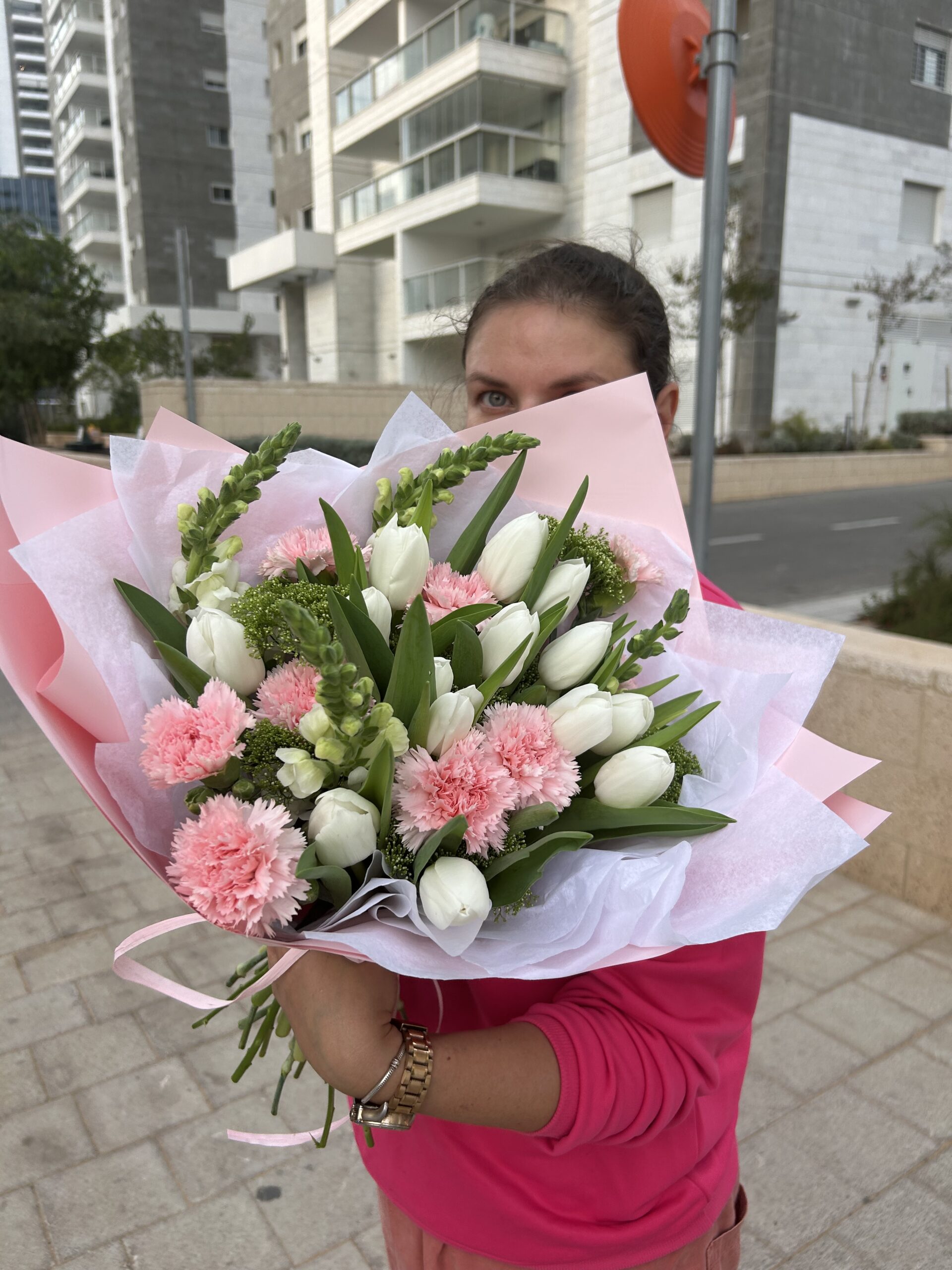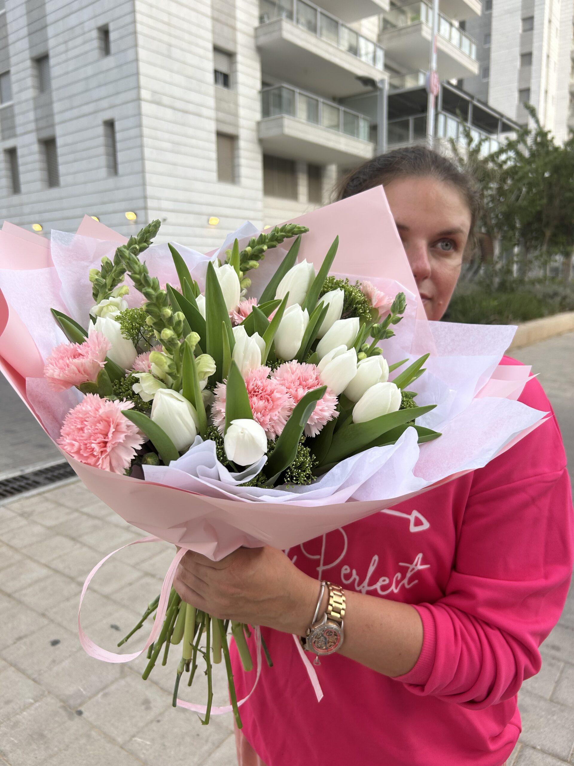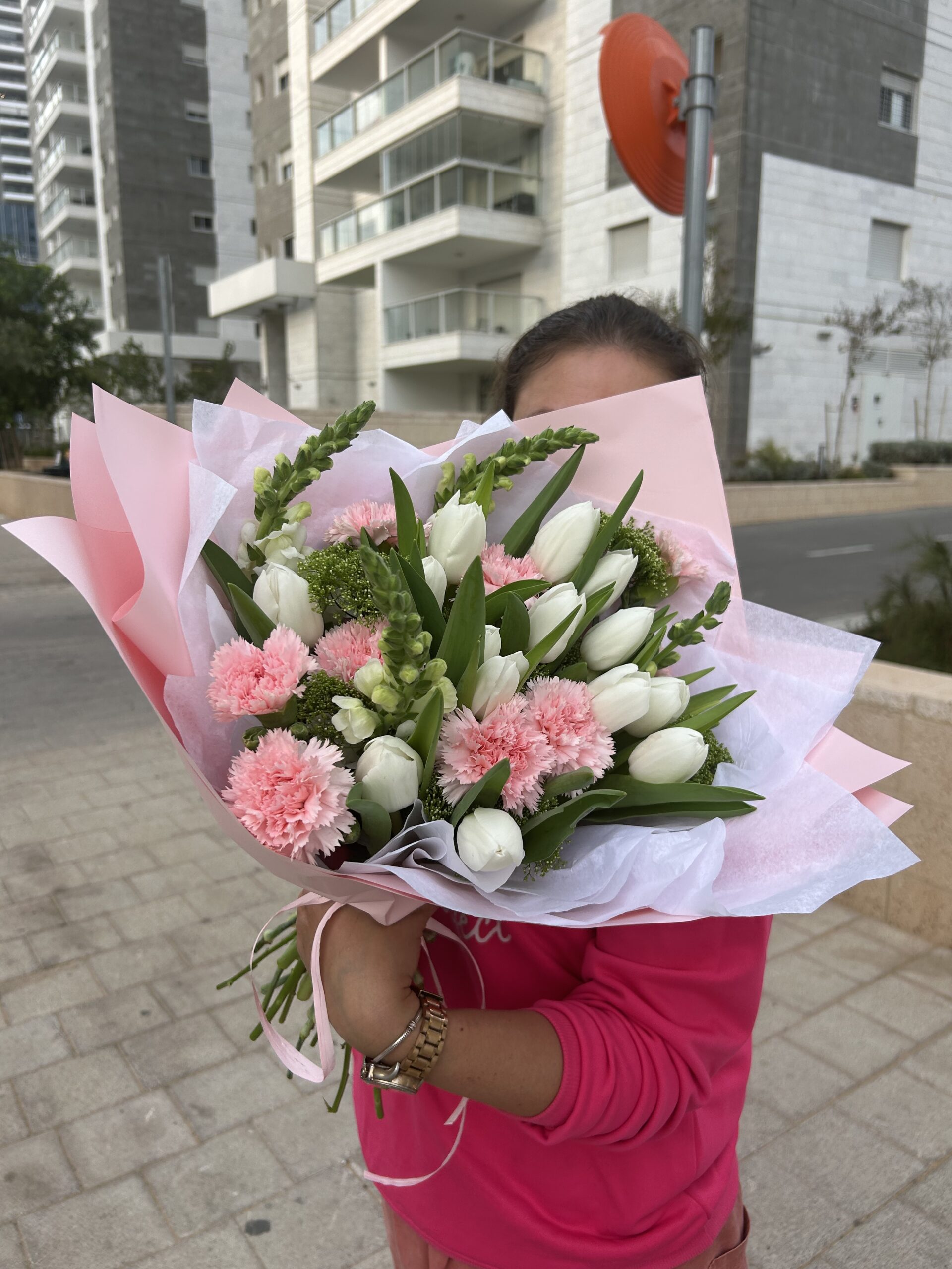 הזר הזה כובש בעדינותו ובקלילותו. הקומפוזיציה מתמקדת בצבעוני לבן טהור, המסמל טוהר, רעננות ויופי מעודן. הפרחים מלווים בציפורנים עדינות בגוון אפרסק, שמוסיפות נגיעות חמימות ומעוררות תחושת רוך ונחמה.