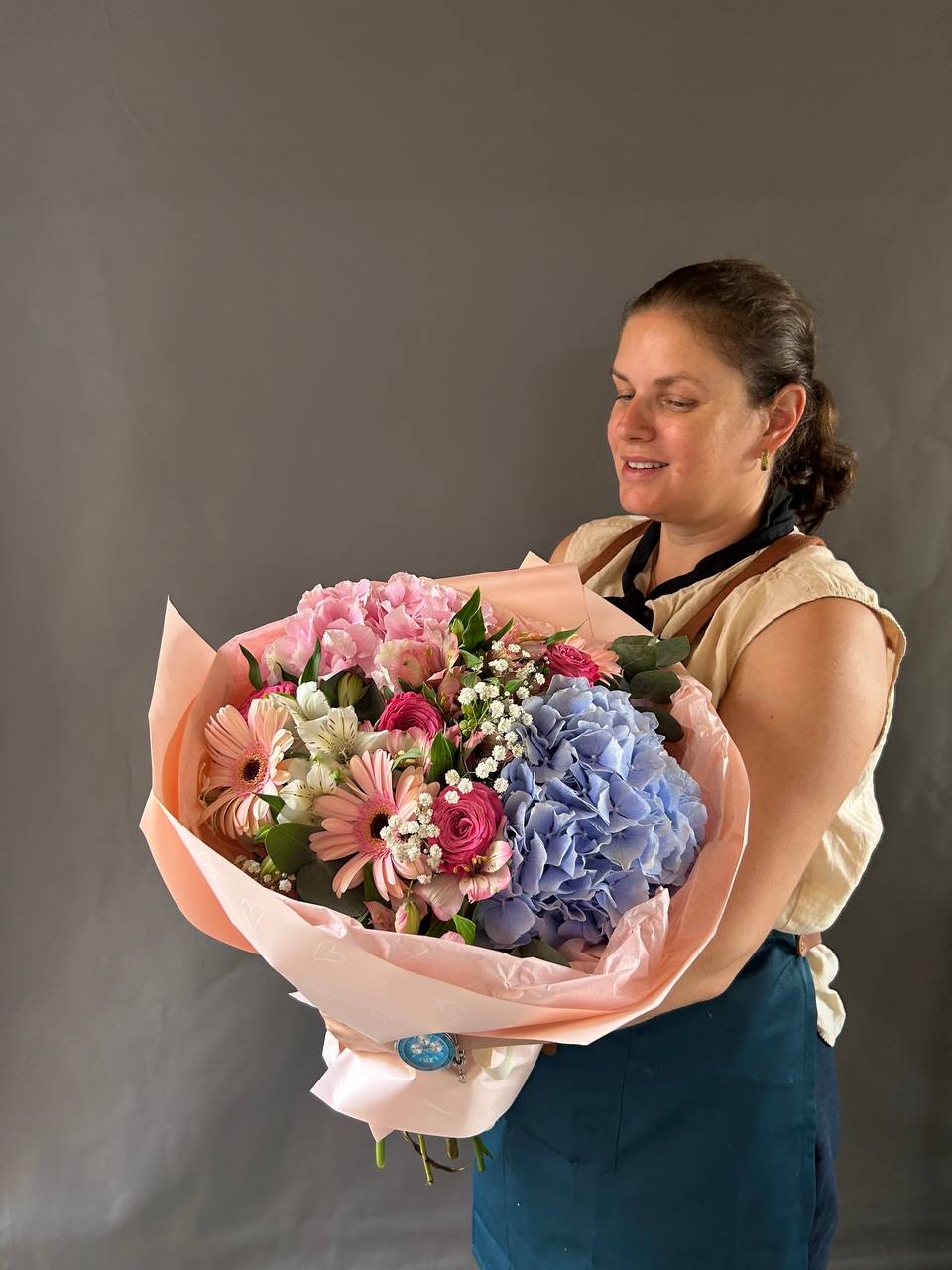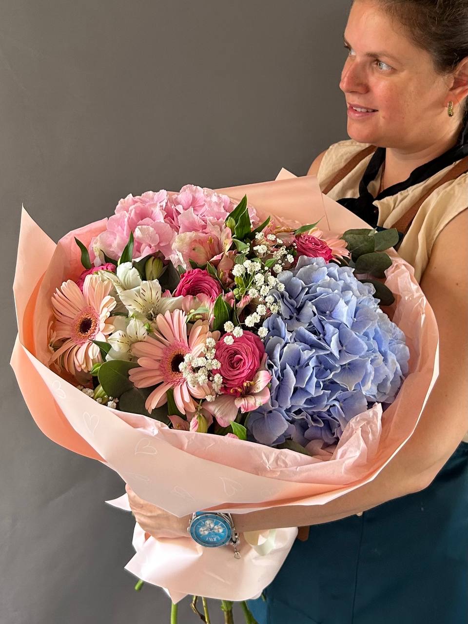 Погрузитесь в мир утончённой красоты с букетом, который объединяет классику и современность. В его сердце — пышные гортензии, символ искренности и изящества. Их воздушные соцветия создают мягкий фон, на котором ярко играют альстромерии — цветы дружбы и преданности, добавляющие легкую нотку игривости.