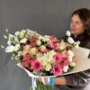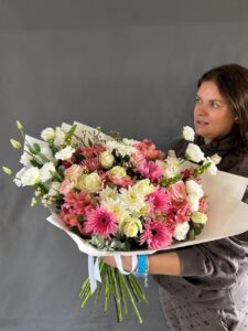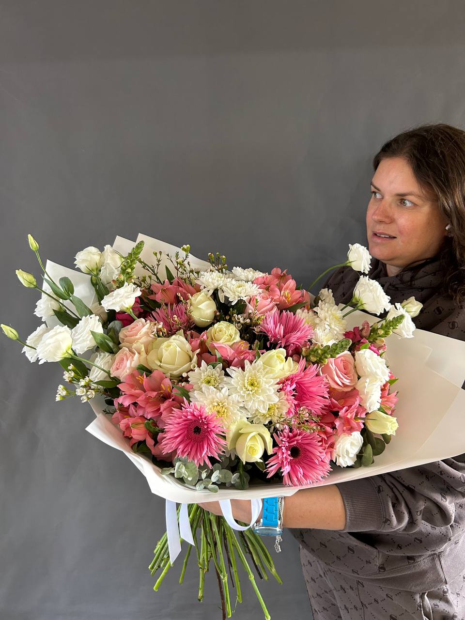 Изысканный букет, сочетающий свежесть и очарование. Белые розы, розовые герберы, нежные хризантемы и мягкие сезонные акценты — всё это оформлено в белую упаковку. Прекрасный выбор для праздников, душевных подарков или стильного декора.
