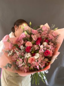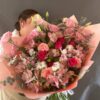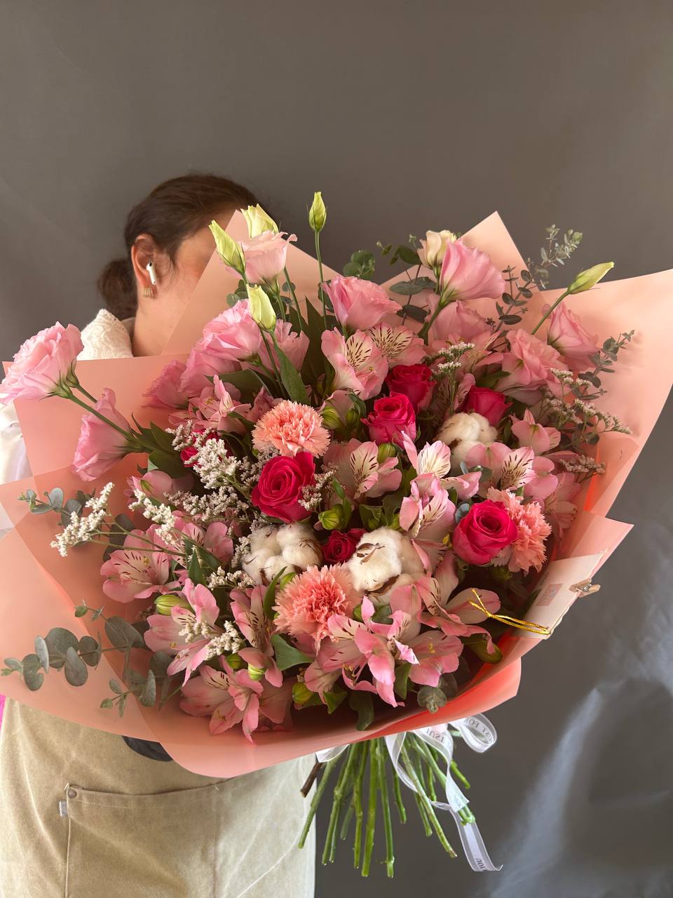 Насыщенный и выразительный букет, сочетающий страсть и элегантность. Глубокие оттенки розовых и красных роз, гвоздики, эустомы, альстромерии, хлопковые соцветия и эвкалипт — всё это оформлено в нежную розовую упаковку с декоративными лентами. Прекрасный выбор для романтических моментов, праздников или уютного декора.