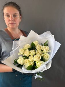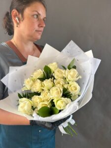 Элегантный букет, воплощающий чистоту и утонченность. Кремовые розы в окружении зелени создают нежное романтичное настроение. Упакован в белую бумагу с изящным узором из сердечек и перевязан атласной лентой — идеально для особых случаев, подарков и стильного оформления.