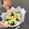 Элегантный букет, воплощающий чистоту и утонченность. Кремовые розы в окружении зелени создают нежное романтичное настроение. Упакован в белую бумагу с изящным узором из сердечек и перевязан атласной лентой — идеально для особых случаев, подарков и стильного оформления.