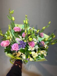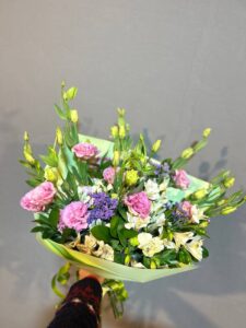 Лёгкий и жизнерадостный букет, наполненный свежестью и природной гармонией. Нежные гвоздики, альстромерии, статица и зелёные бутоны создают яркую композицию, которая поднимает настроение и дарит ощущение заботы. Обёртка в светло-зелёных тонах подчёркивает естественную красоту цветов и делает букет особенно выразительным.