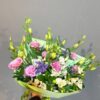 Лёгкий и жизнерадостный букет, наполненный свежестью и природной гармонией. Нежные гвоздики, альстромерии, статица и зелёные бутоны создают яркую композицию, которая поднимает настроение и дарит ощущение заботы. Обёртка в светло-зелёных тонах подчёркивает естественную красоту цветов и делает букет особенно выразительным.