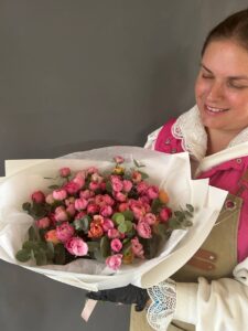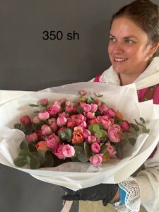 Яркий букет, воплощающий радость и утонченность. Нежные розовые и коралловые розы в сочетании со свежими листьями эвкалипта, оформленные в белую упаковку, создают изысканный образ. Идеален для подарка, украшения интерьера или особого момента.