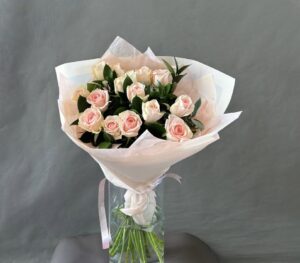 Нежная и утончённая композиция из светло-розовых роз, оформленная в стеклянной вазе. Зелёная листва добавляет глубины и свежести, а обёртка в бело-розовых тонах с аккуратной лентой подчёркивает элегантность и чистоту образа. Такой букет — это классика, переосмысленная в современном ключе.