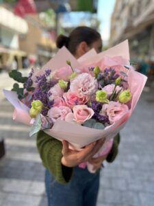 Свежая и стильная композиция, в которой городская энергия сочетается с природной нежностью. Розовые розы, гвоздики, зелёные бутоны, фиолетовая статица и эвкалипт собраны в яркий букет, обёрнутый в светло-розовую бумагу. Он выглядит живо и современно — как цветочный акцент на фоне городской суеты.