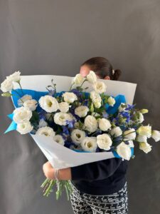 Эффектный букет, сочетающий элегантность и свежесть, оформлен в бело-голубой упаковке и идеально подойдёт для особых случаев.