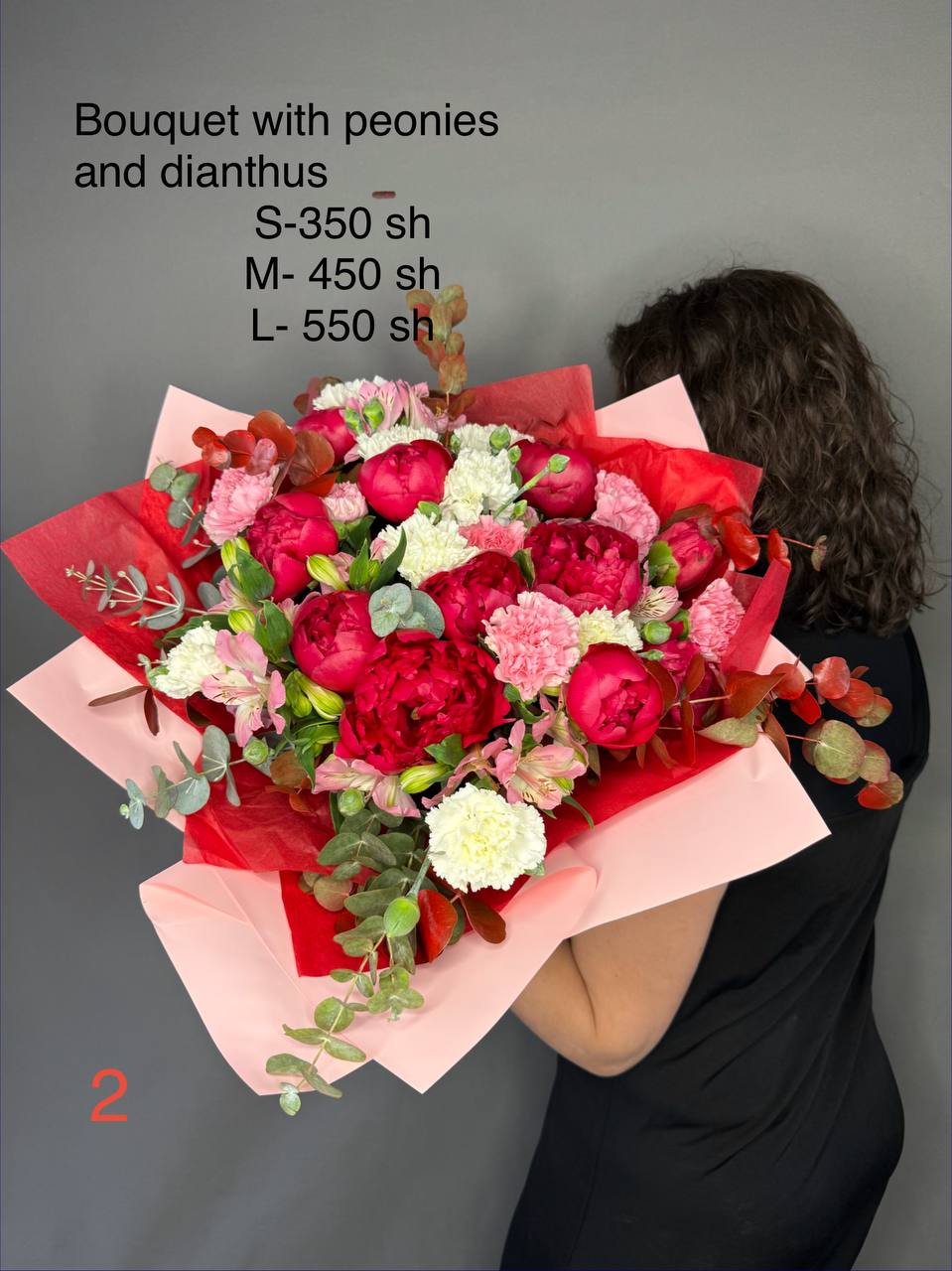 Эта яркая и выразительная композиция создана для тех, кто любит цветы с характером. Бархатные красные пионы, нежные розово‑белые диантусы и декоративная зелень образуют насыщенный, динамичный и очень стильный образ. Контрастная красно‑розовая упаковка подчёркивает глубину оттенков и делает букет по‑настоящему эффектным. Такой подарок идеально подходит для особых моментов — особенно на День всех влюблённых, когда хочется выразить чувства ярко, красиво и с эмоцией.