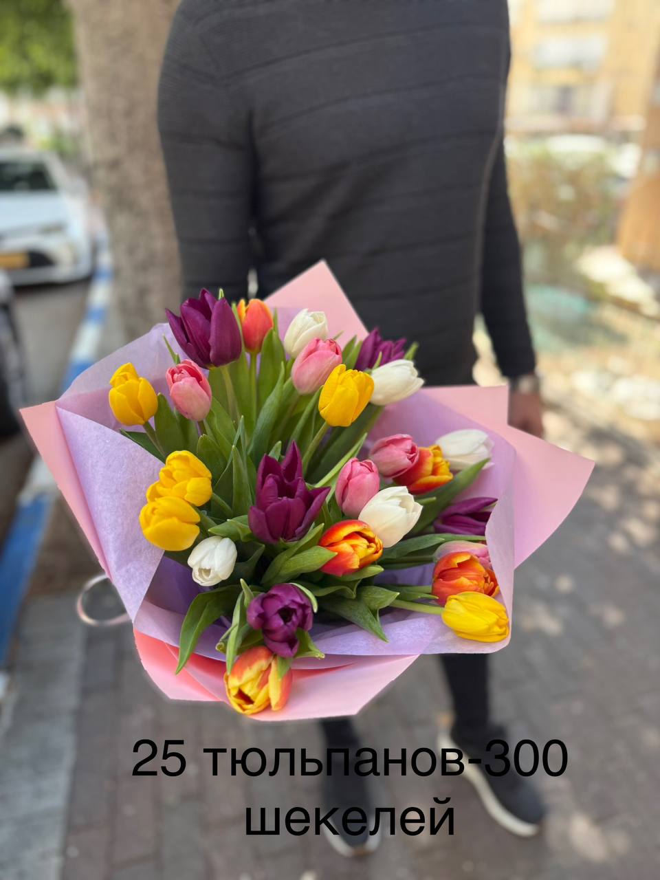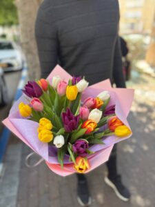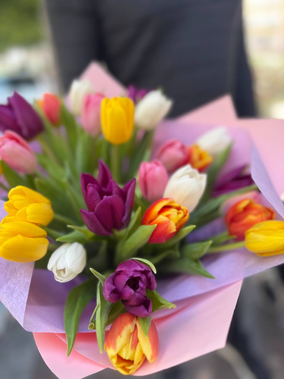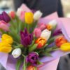 Жизнерадостная композиция из 25 разноцветных тюльпанов, оформленная в нежную розовую и лавандовую упаковку. Сочетание жёлтых, белых, розовых, фиолетовых и оранжевых оттенков создаёт яркое и лёгкое настроение, наполняя букет ощущением весны и свежести. Гармоничная палитра и аккуратное оформление делают эту композицию отличным выбором для поздравлений, тёплых пожеланий или украшения любого пространства.