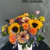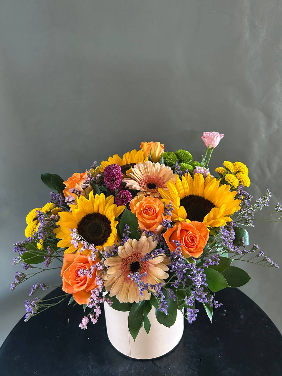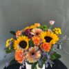 Яркая цветочная корзинка, наполненная солнечным настроением и живыми красками. Подсолнухи, оранжевые розы, герберы, хризантемы, гвоздики и статица создают насыщенную палитру, а зелёные акценты напоминают о свежести абсента. Белая корзина подчёркивает объём и контраст композиции. Идеальный выбор для поздравлений, декора или просто чтобы наполнить пространство светом и радостью.