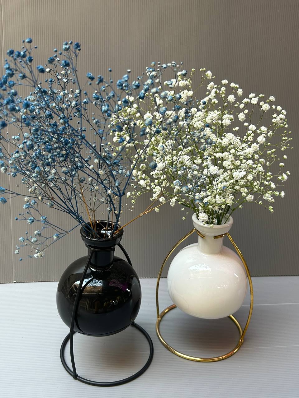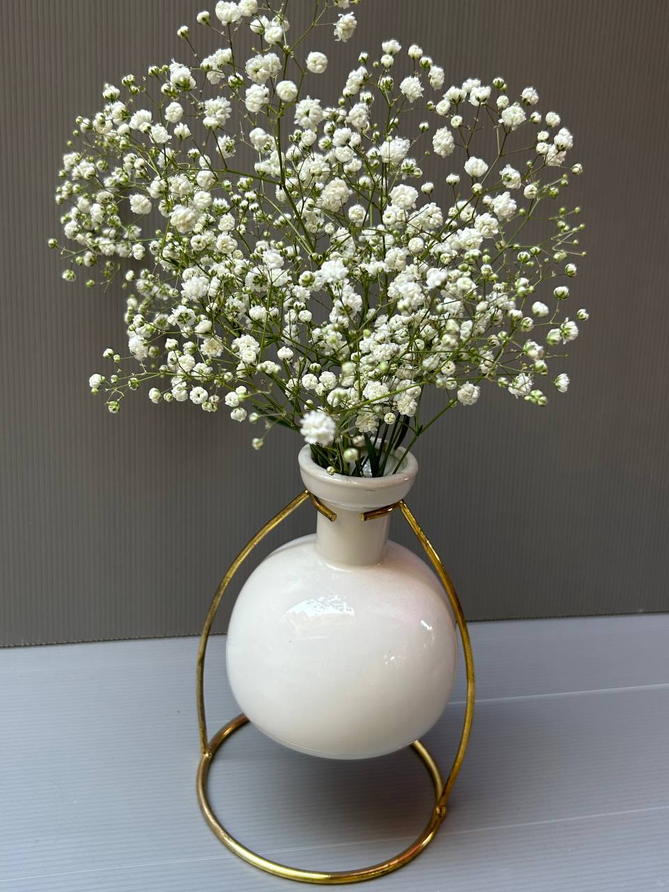 Ваза керамическая на металической подставке, круглая «парящая в воздухе». Высота — 19 см, ширина — 13 см. Есть в белом и чёрном цвете
