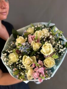 Погрузитесь в атмосферу нежности и свежести с этим утончённым цветочным ансамблем — идеальным воплощением весеннего очарования. Букет сочетает в себе кремовые розы, розовые антирриумы, небесно-голубые акценты, воздушную гипсофилу и сочную зелень, создавая гармоничную композицию, полную жизни и элегантности.