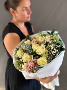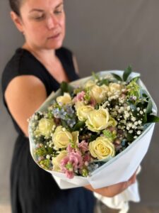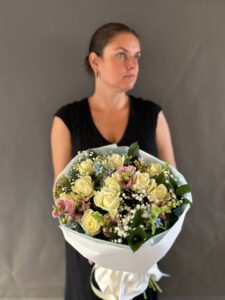 Каждый элемент подобран с любовью, чтобы передать тепло, заботу и радость момента. Обёртка из белой бумаги подчёркивает изысканность и делает букет универсальным подарком — будь то день рождения, благодарность, романтический жест или просто способ порадовать близкого человека.
