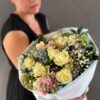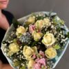 Погрузитесь в атмосферу нежности и свежести с этим утончённым цветочным ансамблем — идеальным воплощением весеннего очарования. Букет сочетает в себе кремовые розы, розовые антирриумы, небесно-голубые акценты, воздушную гипсофилу и сочную зелень, создавая гармоничную композицию, полную жизни и элегантности.