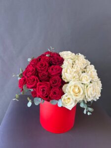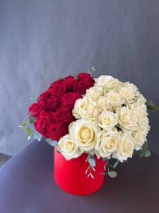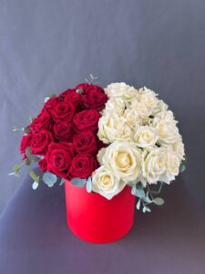Стильная композиция в красной коробке, объединяющая страсть и нежность. Глубокие бордовые розы и кремово‑белые бутоны создают выразительный контраст, подчёркивая элегантность и символику чувств. Веточки эвкалипта добавляют свежести и текстуры. Идеальный подарок для признания, благодарности или особенного момента, когда важны эмоции и эстетика.