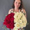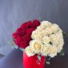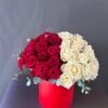 Стильная композиция в красной коробке, объединяющая страсть и нежность. Глубокие бордовые розы и кремово‑белые бутоны создают выразительный контраст, подчёркивая элегантность и символику чувств. Веточки эвкалипта добавляют свежести и текстуры. Идеальный подарок для признания, благодарности или особенного момента, когда важны эмоции и эстетика.